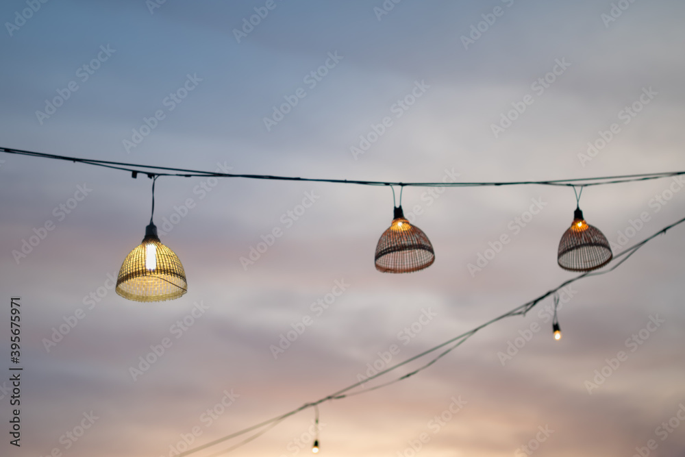 Blurred pastel colored sunset sky against string decorative light with bamboo fish trap lamp.