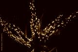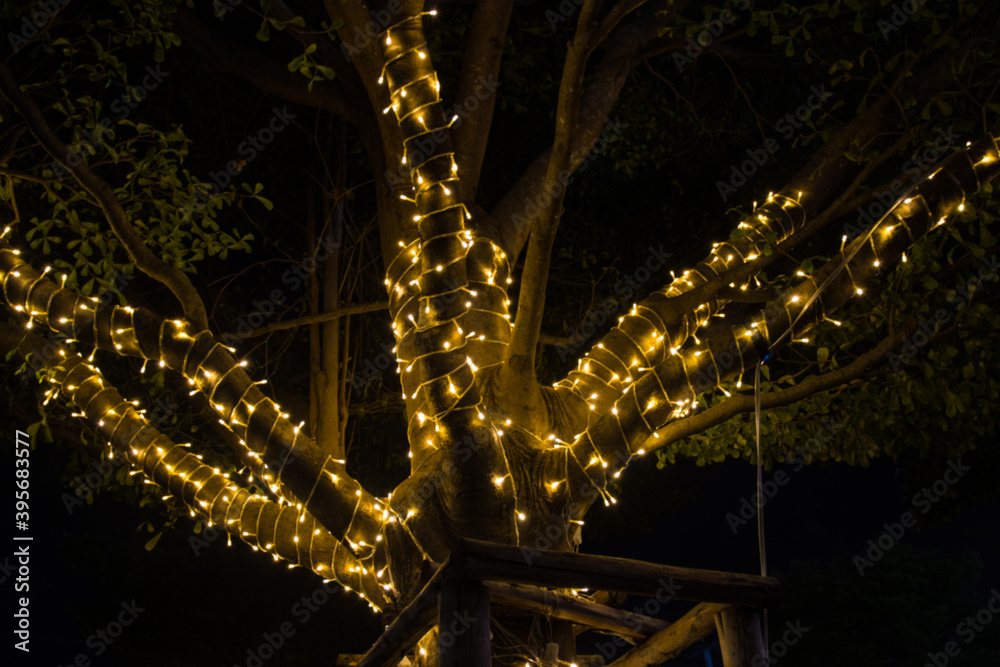 blurred image Decorative outdoor string lights hanging on tree in the garden at night time