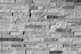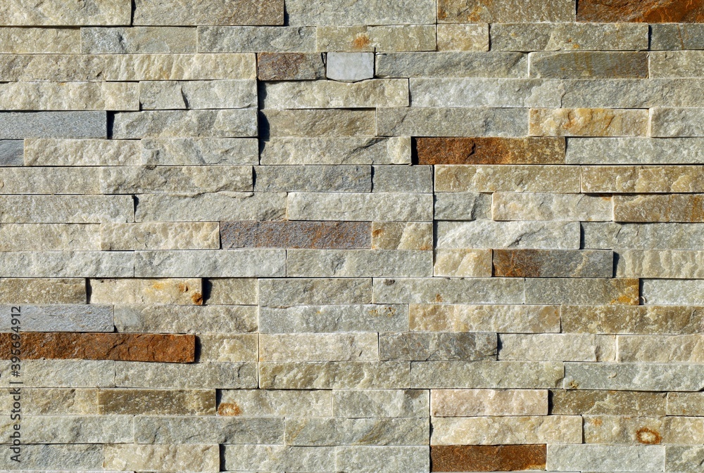 Stone cladding wall made of striped stacked bricks of natural rocks. Colors are shades of gray and brown.Background and texture.