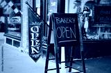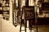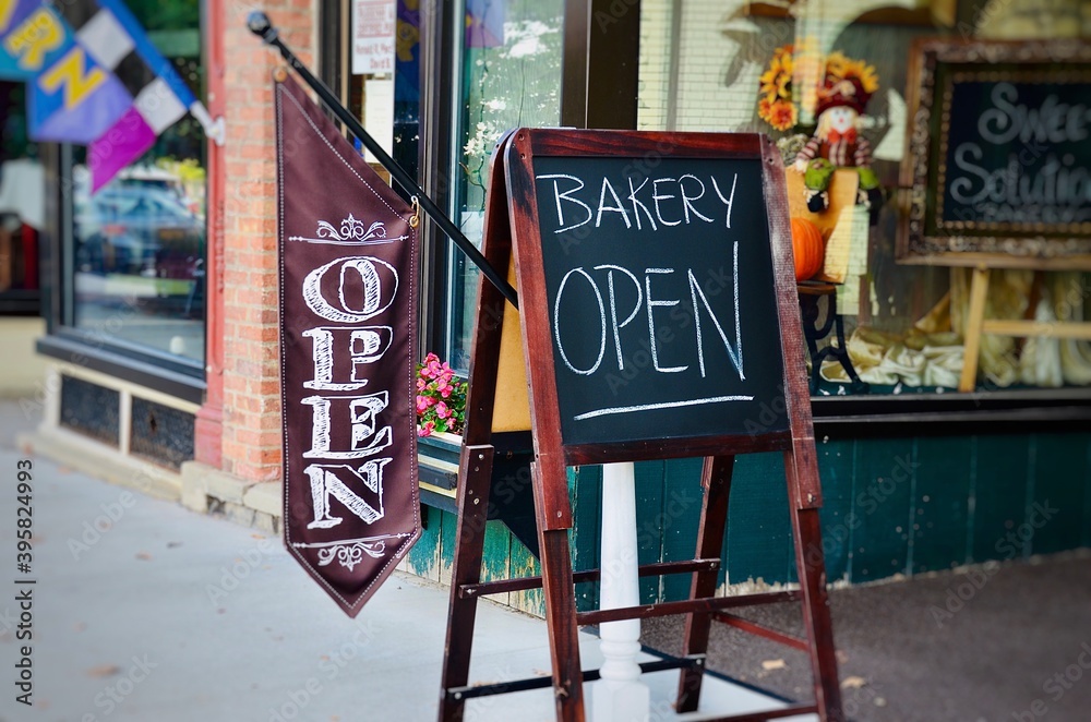 Street view in the small town of Canandaigua, New York. American traditional displays and decorations on sidewalks. Bakery shop with “Open” sign