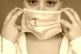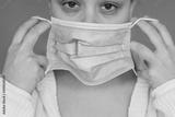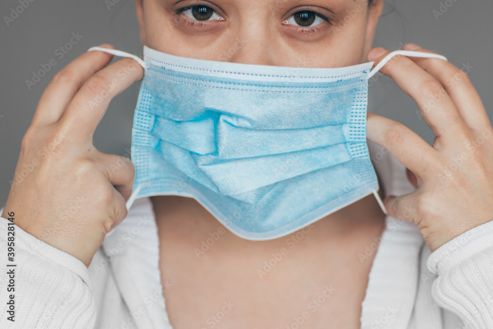 Sick women with dark circles putting protective face mask
