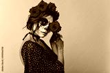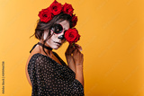 Attractive mature woman in Halloween outfit loves roses. Closeup portrait of mexican woman closing her eyes with red flower