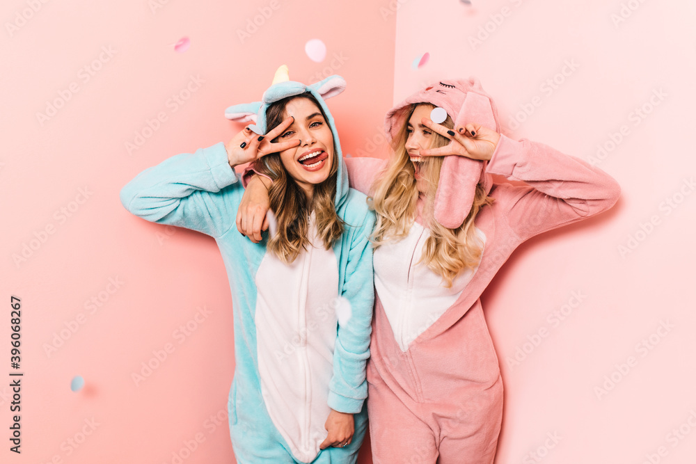 Enchanting girl in pink kigurumi posing with peace sign. Studio shot of charming female model wears funny pajamas.