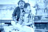 Carpenter teaches young boy to plan wood in a carpentry workshop