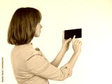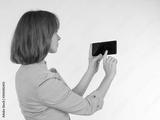 Girl in a yellow jacket holds a phone. She stands sideways to camera. Businesswoman with a smartphone on a white background. Concept - businesswoman demonstrates an apps on her phone. Business apps.