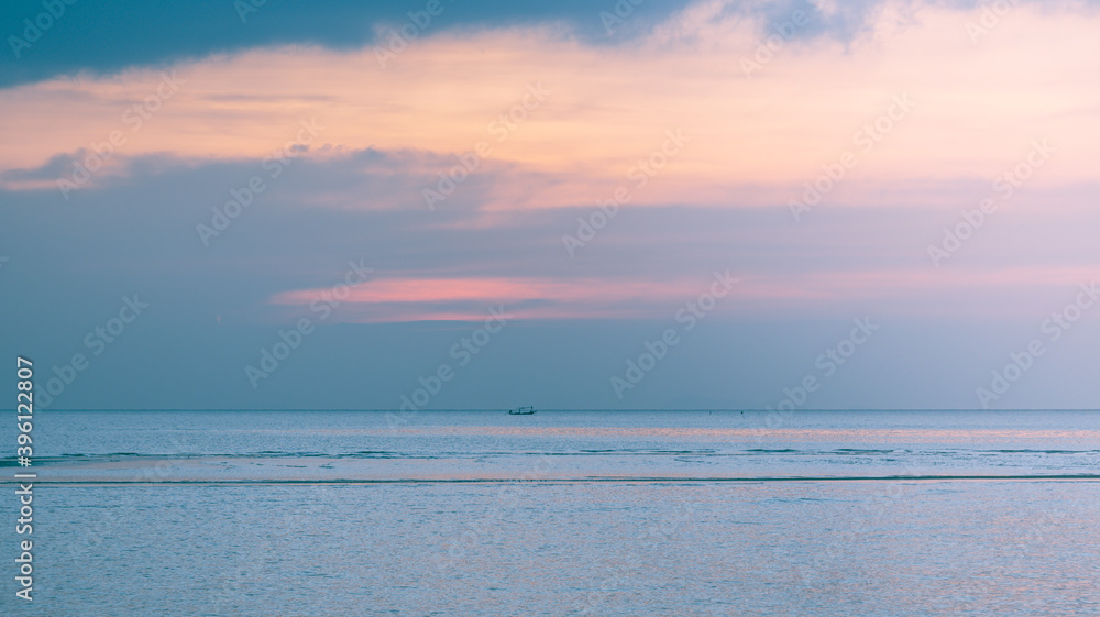 Beautiful pastel beach sunset with blue sea and golden light sky cloud background