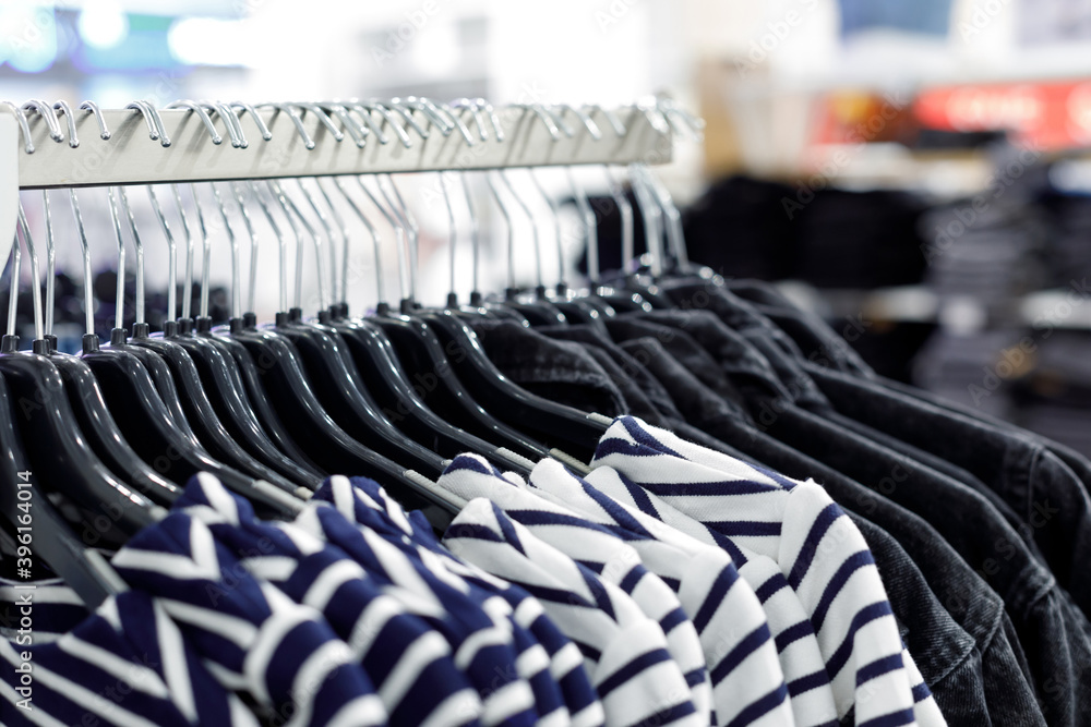 Showcase with casual clothes in the mall. Selective focus Shop of modern fashion. Shallow depth of field. Blurry