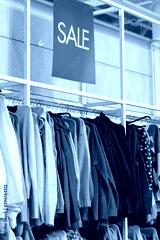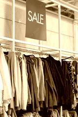 Signboard with the inscription sale in the fashion store. Hangers with clothes during the sale. Black Friday