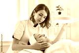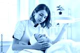 Cosmetologist directing lamp to woman for facial treatment