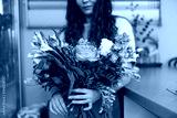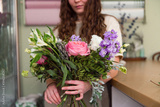 Young woman florist work with flowers at workplace, small business concept, lifestyle, cropped portrait, flowers close up