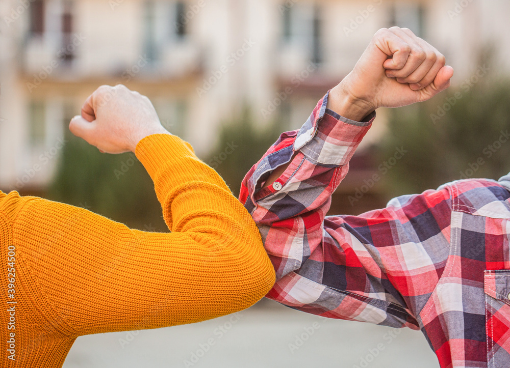 Elbow bump. Bump elbows. Friends shaking elbows outdoors. Elbow greeting style. Coronavirus epidemic. Coronavirus, illness, infection, quarantine, COVID-19. Don't shake hands. Stop handshakes