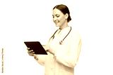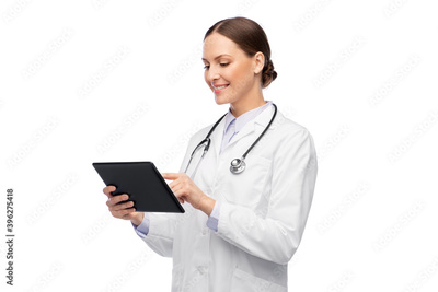 medicine, profession and healthcare concept - happy smiling female doctor in white coat with tablet pc computer and stethoscope
