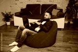 Young bearded man sit on the red armchair in home office, work on laptop and speak with clients.
