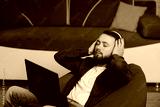 Young man with closed eyes in earphones sit relax on armchair in living room while listening the music.