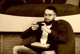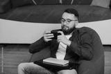 Handsome guy in glasses is using cellphone while sitting on armchair at home.