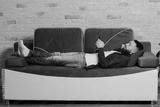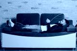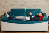 Man is relaxing on a lounge and using mobile phone. He lying on the blue sofa.
