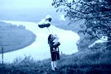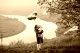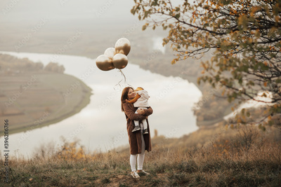 Happy Mom with closed eyes is hugging her daughter in autumn day.