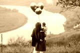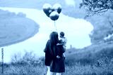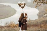 Mom, son and daughter with balloons on the autumn hill with river on the background. Back view.