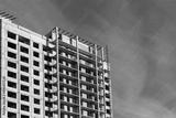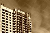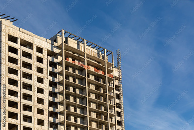 Construction of a typical multi-storey building against the blue sky. Monolithic concrete frame filled with silicate blocks and bricks. Copy space