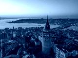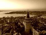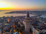 Aerial Galata Tower at Sunset. Galata Bridge and Golden Horn of Istanbul with beautiful colors at Sunset.