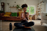 Portrait of smiling young african woman using smartphone after routine wokout with bottle besides at home