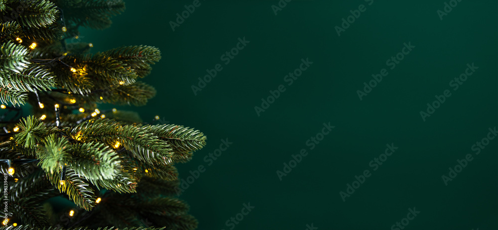 Decorated with ornaments and lights Christmas tree on green background. Merry Christmas and Happy Holidays greeting card, frame, banner. New Year. Noel