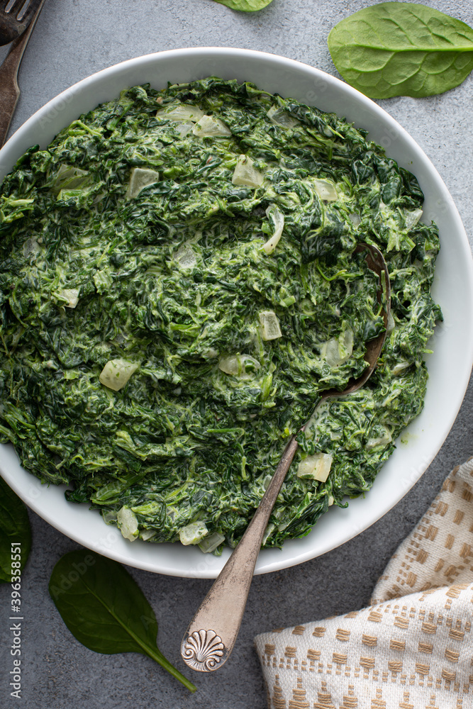 Creamed spinach with garlic in a white bowl overhead view