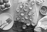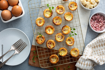 Mini ham and cheese quiches freshly baked on a cooling rack