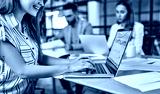 Glad to be on the team. Beautiful cheerful woman working at a laptop sitting at an office table with her colleagues.