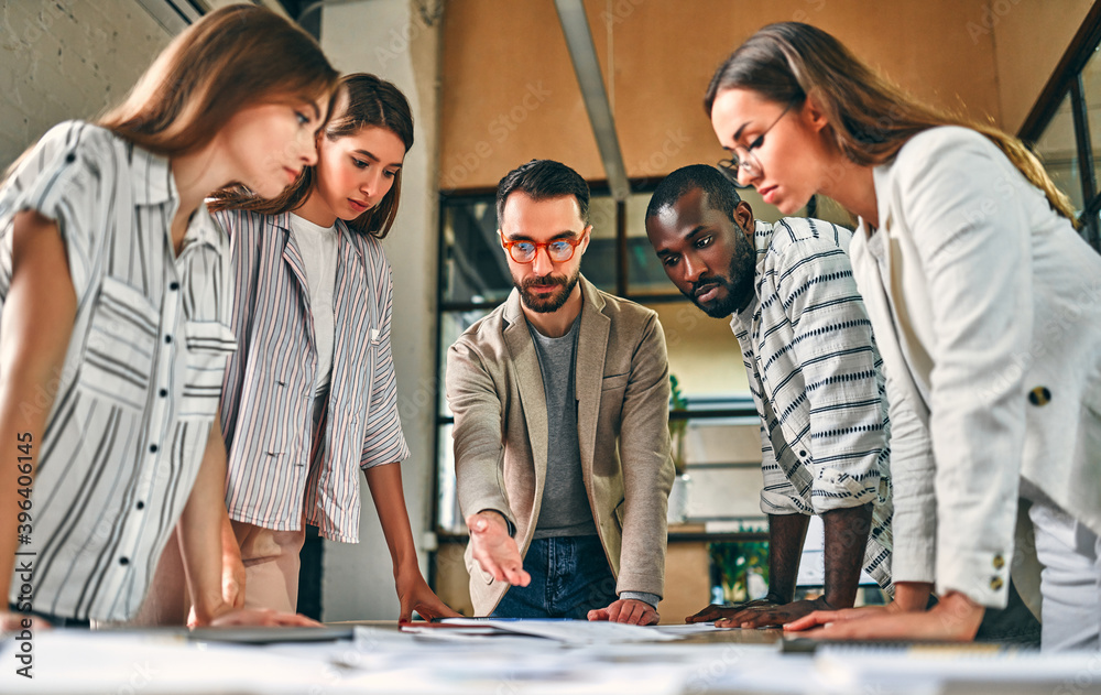 Staff meeting. Group of young modern people in smart casual wear discussing something while working in the creative office.