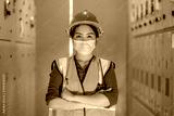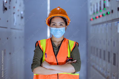 Portrait woman worker under inspection and checking production process on factory station and safety mask face to protect for pollution and virus in factory.