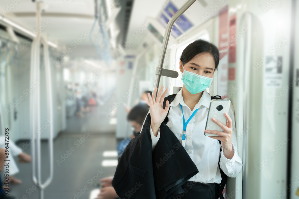 New normal concept.Attractive asian business woman wearing face mask in the public metro during coronavirus pandemic.Woman wearing face shield and white shirt while business travel trip to the office.