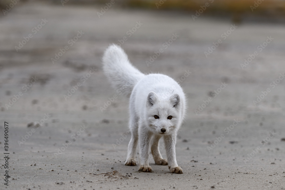 Arctic fox (Vulpes Lagopus) in wilde tundra. Arctic fox on the beach.