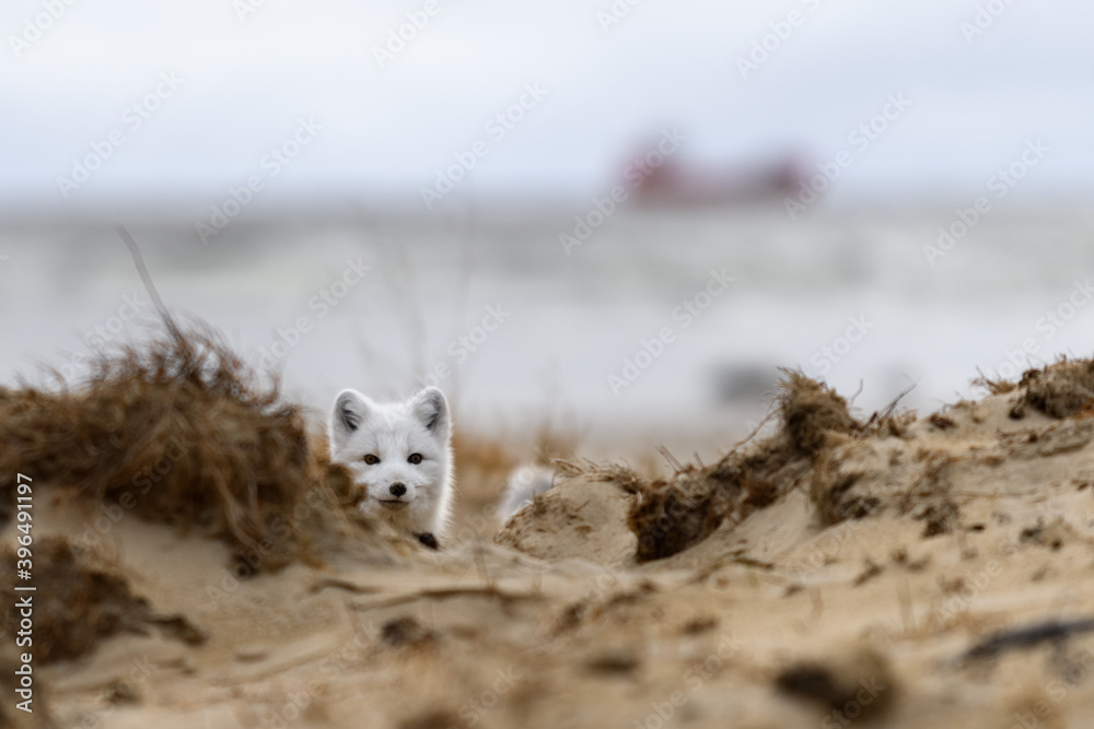 Arctic fox (Vulpes Lagopus) in wilde tundra. Arctic fox has hidden.