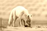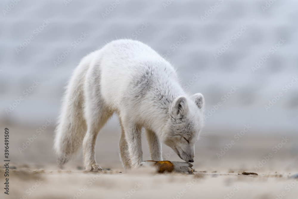 Arctic fox (Vulpes Lagopus) in wilde tundra. Arctic fox on the beach.