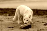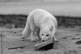 Arctic fox (Vulpes Lagopus) in wilde tundra. Arctic fox playing with wood.