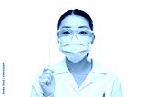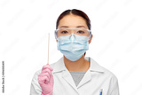 medicine, health and pandemic concept - young asian female doctor or scientist in medical mask and goggles holding test cotton swab