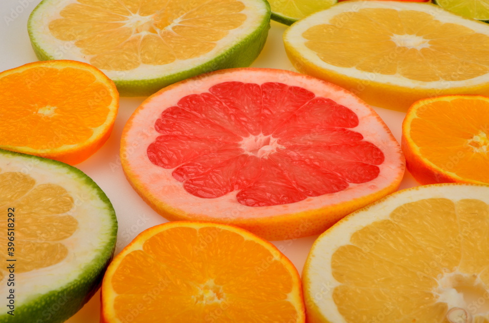Sliced citrus fruits background. Red grapefruit, oranges, lemons, lime, mandarins