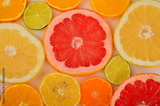 Sliced citrus fruits background. Red grapefruit, oranges, lemons, lime, mandarins