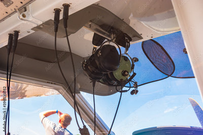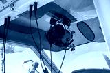 Pilot's headphones in the cockpit. In the background, a man looks up to the sky