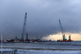 Construction Marine offshore works. Dam building, crane, barge, dredger. Breakwater construction.