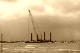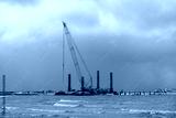 Construction Marine offshore works. Dam building, crane, barge, dredger. Breakwater construction.