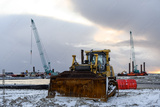 Construction Marine offshore works. Dam building, crane, barge, dredger. Breakwater construction.