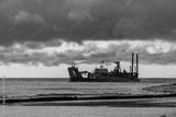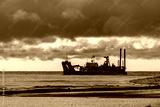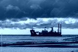 Vessel engaged in dredging. Dredger working at sea. Ship excavating material from a water environment.