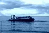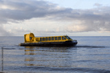 Hovercraft flying above water. Air cushion sailing near beach. Yellow hover craft under way.