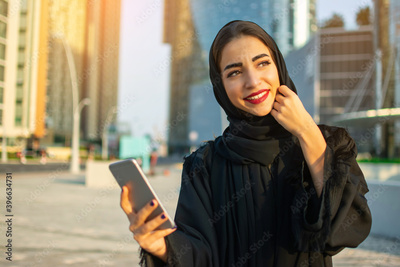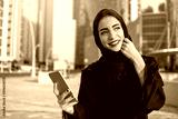 Portrait of young muslim business woman wearing abaya using smartphone on the city street.