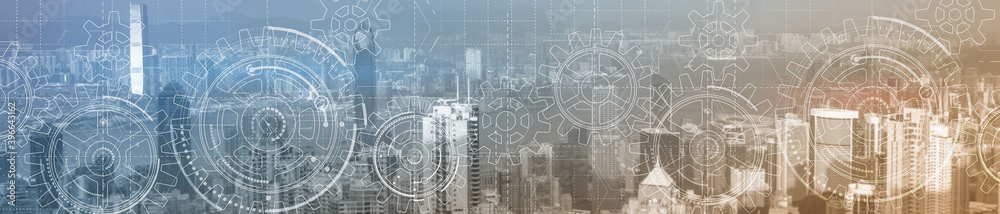 Cogs and gear wheel mechanisms. Hi-tech. Abstract Business and Technology background. Modern night city.
