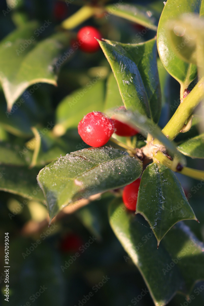 Close-up of frost on holly bush with red ripe berries in the garden at dawn