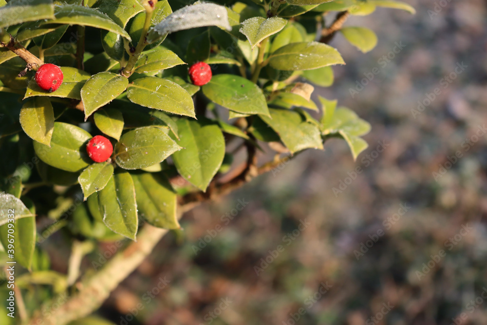 Close-up of frost on holly bush with red ripe berries in the garden at dawn