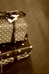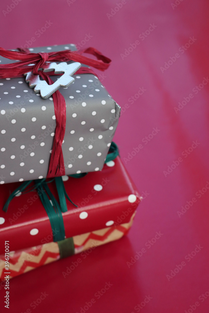 Stack of Christams gift boxes on red background on selective focus. Christmas background with copy space